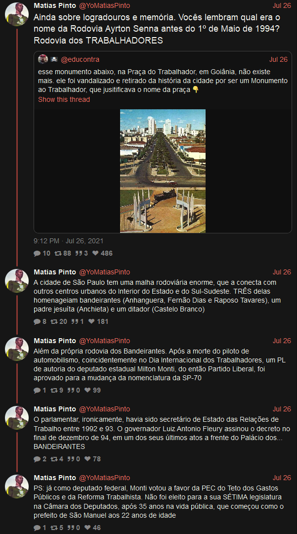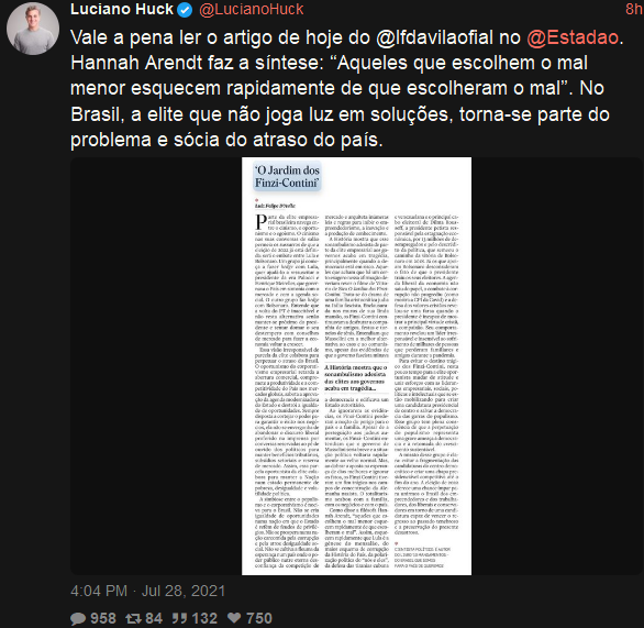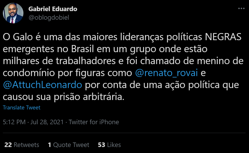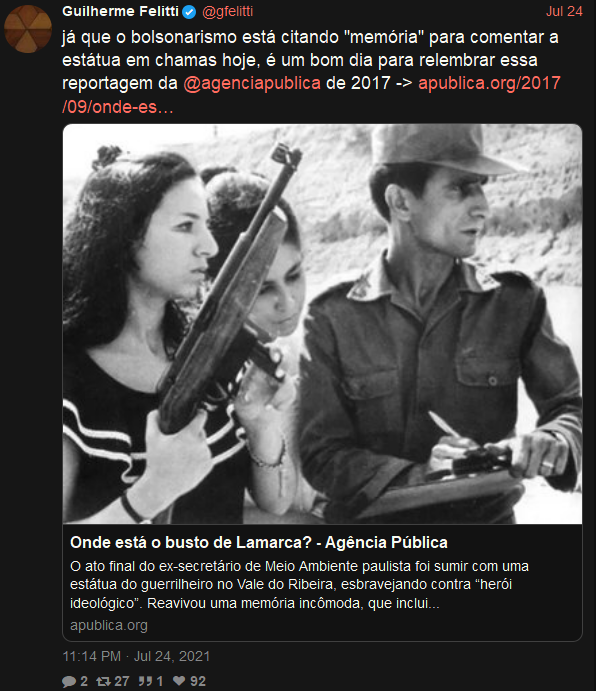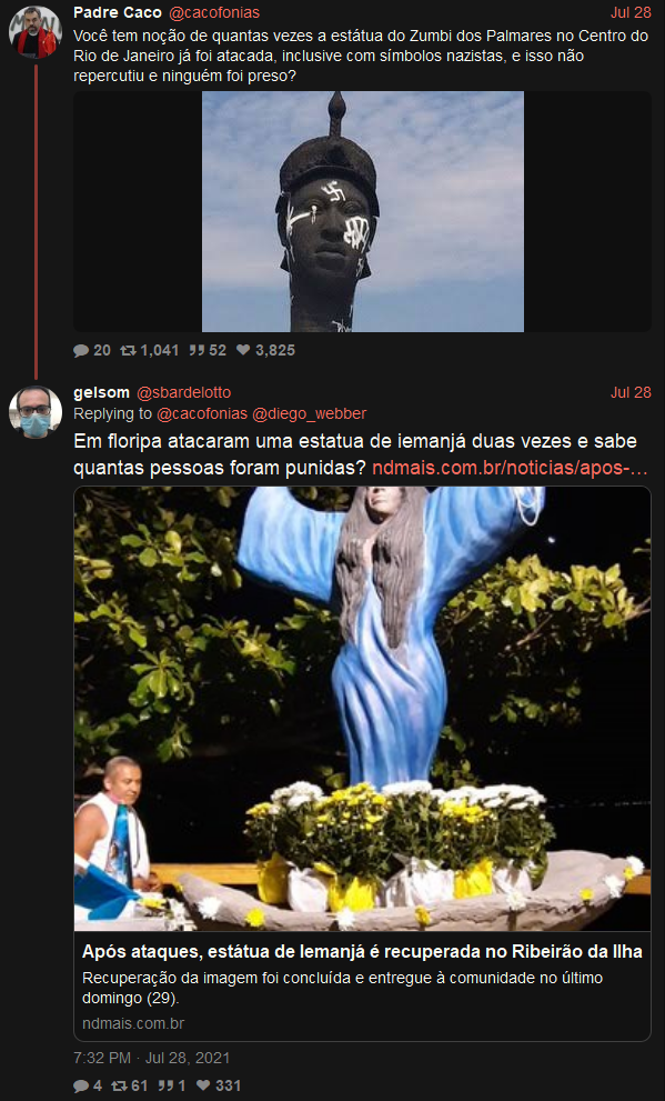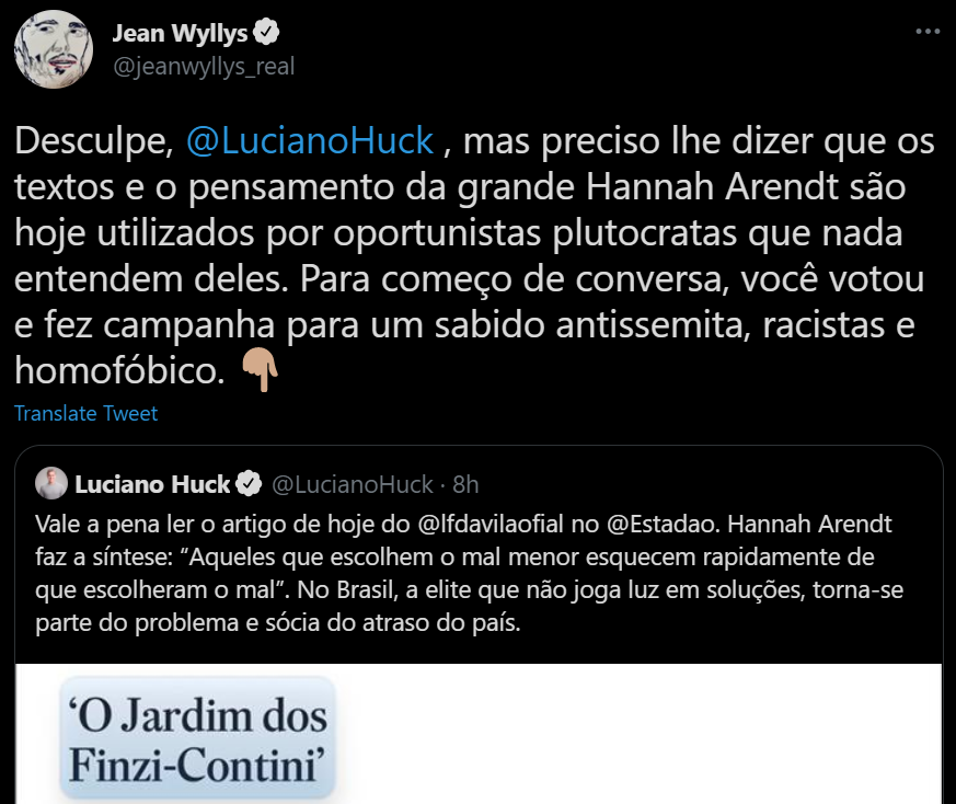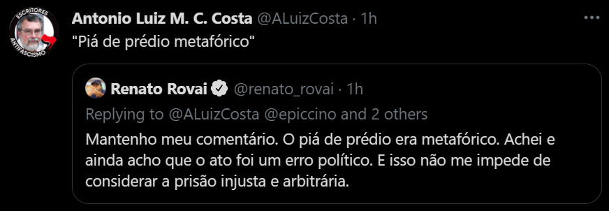 Não há como sair desta merda sem retribuição, expurgos e violência. A saída que requer justamente o mínimo de violência é aquela que passa pela perseguição aberta e declarada dessa corja. Chegamos aqui por ficarmos 500 anos sem punir culpados (e é um milagre as coisas nã terem chego neste nível antes), e, como a corja decidiu abusar deliberadamente dessa impunidade, sair daqui, necessariamente, requer o fim desse meio milênio de anistia. Eu não falo da boca pra fora quando repito que perseguição será uma pré-condição para a cura, não digo isso por puro ultraje (embora este esteja presente) mas como uma observação objetiva. Enquanto não houver um ritual coletivo de expiação violenta e direcionda, vai ser um Bolsonaro atrás do outro. Se Lula não fizer nada nesse respeito, seu retorno terá sido em vão. Isto, aliás, é um dos motivos pelo qual digo que a propaganda pelo ato pode ser útil pela primeira vez na história, pois estaria cumprindo essa tarefa, digamos, espiritual.